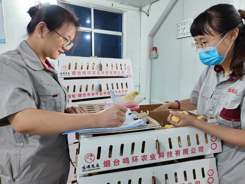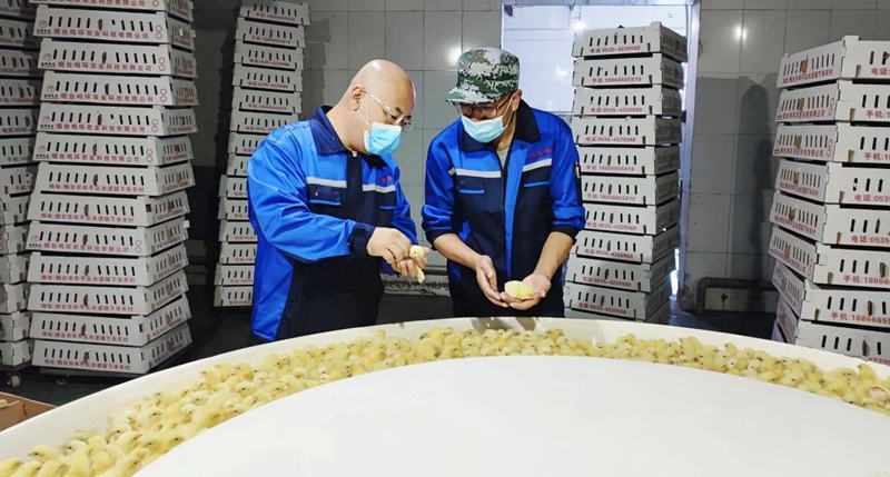 在雛雞處理現(xiàn)場,董事長宋永先生在鳴環(huán)科技總經(jīng)理姚恩先生的陪同下,仔細(xì)查看雛雞狀況,并不時(shí)與員工認(rèn)真交談雛雞挑選及質(zhì)量保障。