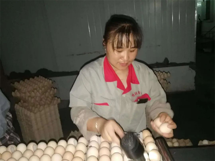 工作中,張莉與照蛋組的家人們右手持燈逐個逐行地照,左手將無精蛋、弱精蛋、死精蛋、臭蛋、破蛋等挑出放在身旁的紙箱里,將小頭朝上的蛋翻過來,照蛋過程頭腦、動作反應要快,對某個種蛋的觀察、判斷要在一瞬間完成,做到 “輕、穩、準、快”。張莉帶領的照蛋組為減少細菌污染胚蛋、提高孵化率和雛雞質量、合理利用設備、準確推測孵化效果及種雞的生產狀態打下堅實的基礎。