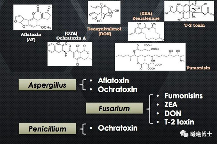 目前已知的霉菌毒素超過了300種。其中最常見的、與畜牧業最息息相關的,是這三種霉菌產生的6種毒素: