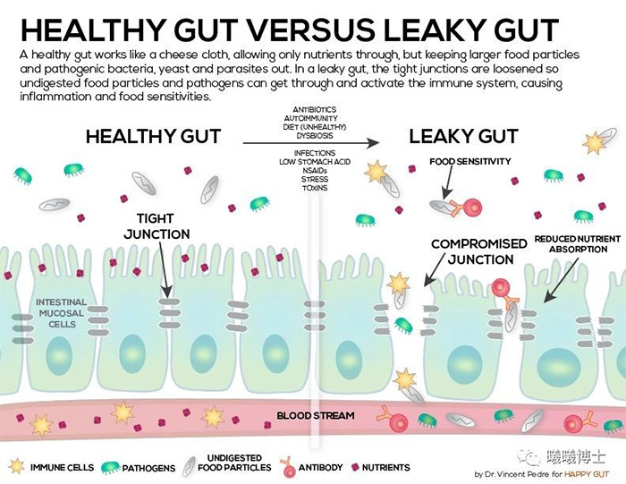 腸道屏障功能的重要性大家應該都很熟悉了。這無數個腸道上皮細胞挨個排成一列,就好像一列士兵手挽著手,組成了一道抵抗外來有害物質的有力防線。那么,細胞與細胞之間靠什么連接呢?靠的是「緊密連接蛋白」家族(tight junctions)。可以想像,一旦緊密連接蛋白的合成、形態、或活性受損,細胞與細胞之間的間隙就會打開,細胞旁通透性(paracellular permeability)升高,那么,腸腔中不論好的壞的東西都能蜂擁而入,進入循環系統,對動物身體各個部位造成危害。同時,這個通透是雙向的,因此血液中本來要運輸給其它組織所用的營養物質,也有可能會倒漏入腸腔。這也就是我們俗稱的leaky gut。