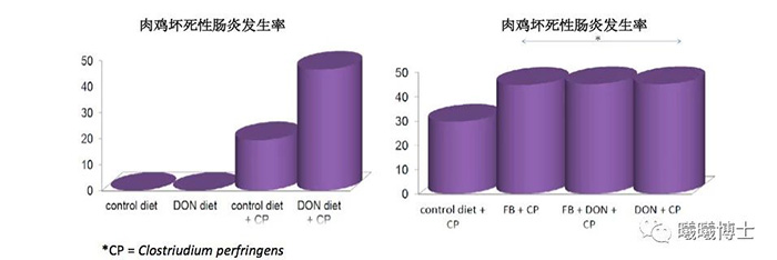 答案是:會。當肉雞攝入被低濃度的DON所污染的飼料后,在面臨細菌感染時(Clostriudium perfringens), 壞死性腸炎的發生率會大大增加20 -47%。根據前面的討論,我們可以推測,DON在肉雞體內破壞了腸道屏障功能 ——leaky gut造成營養物質倒流入腸腔;同時,飼料消化吸收率降低,增加了未被消化的營養物質在腸腔的逗留。這些營養物質為細菌在腸道的增殖提供了極好的基礎,也就因此增加了致病的概率。而如若換種毒素、換種細菌來看,結果也相似——例如,當種雞攝入低濃度的鐮刀菌類毒素時,機體對球蟲病的恢復會顯著減慢。