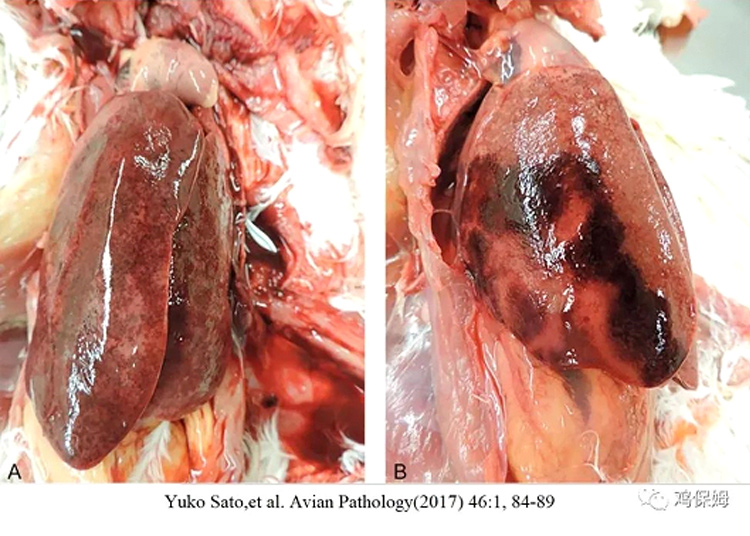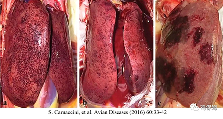 蛋雞在11周和18周分別免疫兩次沙門氏菌滅活油苗,胸肌或腿肌注射。雞只通常在免疫后2-3周呈現死亡高峰,然后快速下降。呈現出肝臟腫大、散在出血點和蒼白壞死灶(如下圖)。